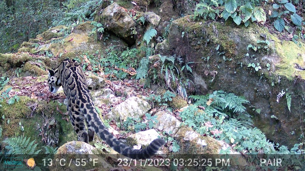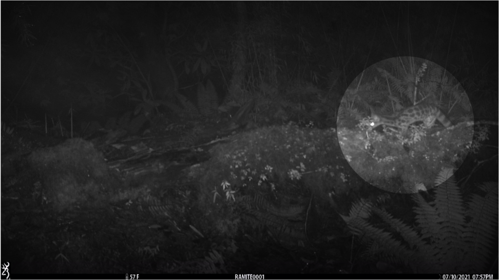 Since the first recording was transmitted, we have recorded 12 independent events across four stations (records are counted as an independent event if the same species doesn’t appear again for at least 30–60 minutes in front of the same camera), in what could be one of the highest numbers of independent events recorded for this species in the world. Linsangs are listed as Endangered on the National Red List of Nepal and also one of the 27th protected priority species; these multiple detections across different stations are significant. They hint that the linsang is more adaptable in elevation than previously thought and that Barun’s abundant oak rhododendron forests with dense undergrowth vegetation provides a critical refuge.