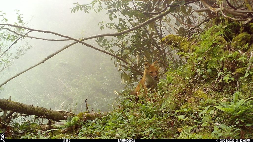 The Dhole’s photograph felt different—less mysterious, more immediate. Normally, these wild dogs are social, hunting in coordinated packs, yet every one of our six records from two stations showed a solitary individual. Its presence confirmed what some elders had whispered: dholes still move through these valleys. But why alone? Are populations too small for stable packs, or are they dispersing from neighboring landscapes like Kanchenjunga? Could the Barun Valley be the place where they begin to form packs again? The Barun offers everything they need—steep terrain, dense forests, and abundant prey such as Himalayan tahr, goral, and macaques. Globally listed as Endangered, dholes are a keystone predator, and their disappearance would ripple through the entire ecosystem.
